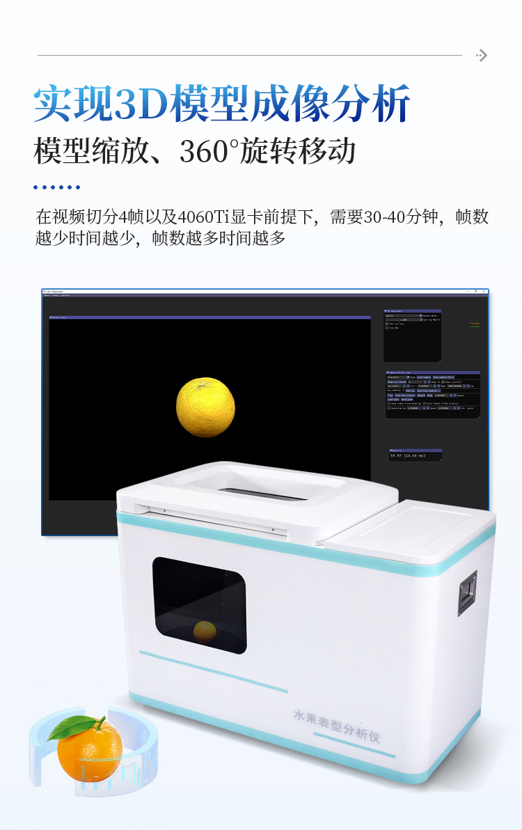 水果表型分析是根据图像识别、3D Gaussian Splatting等技术实现模型成像以及分析的。本产品使用了新的AI成像分析技术,在多视角的条件下对苹果、橘子、梨、西瓜等水果进行扫描,通过生成3D点云图并动态绘制水果表面纹理等操作构建三维的水果模型。同时在进行模型成像过程中也会对水果的形态、纹理、颜色等特征进行分析。